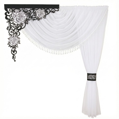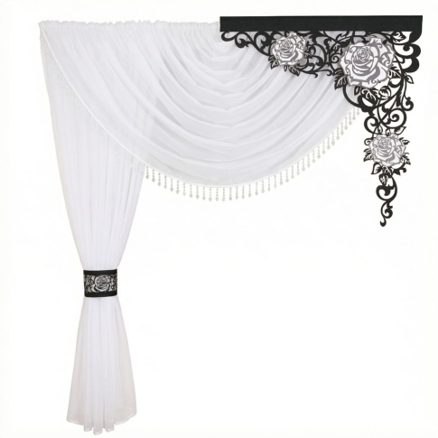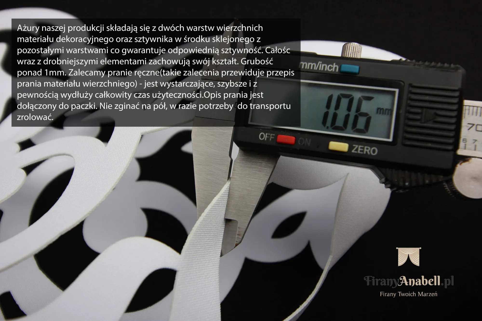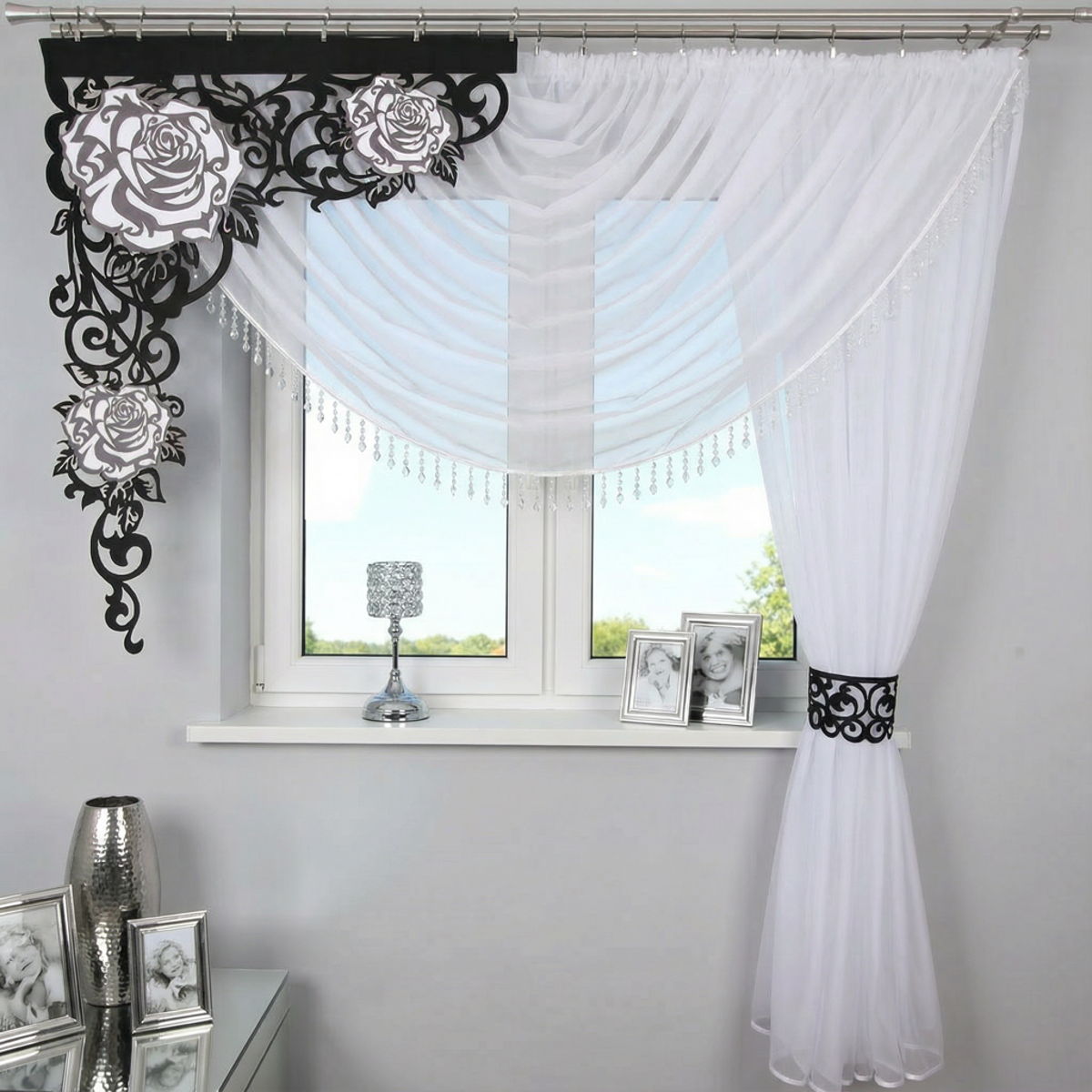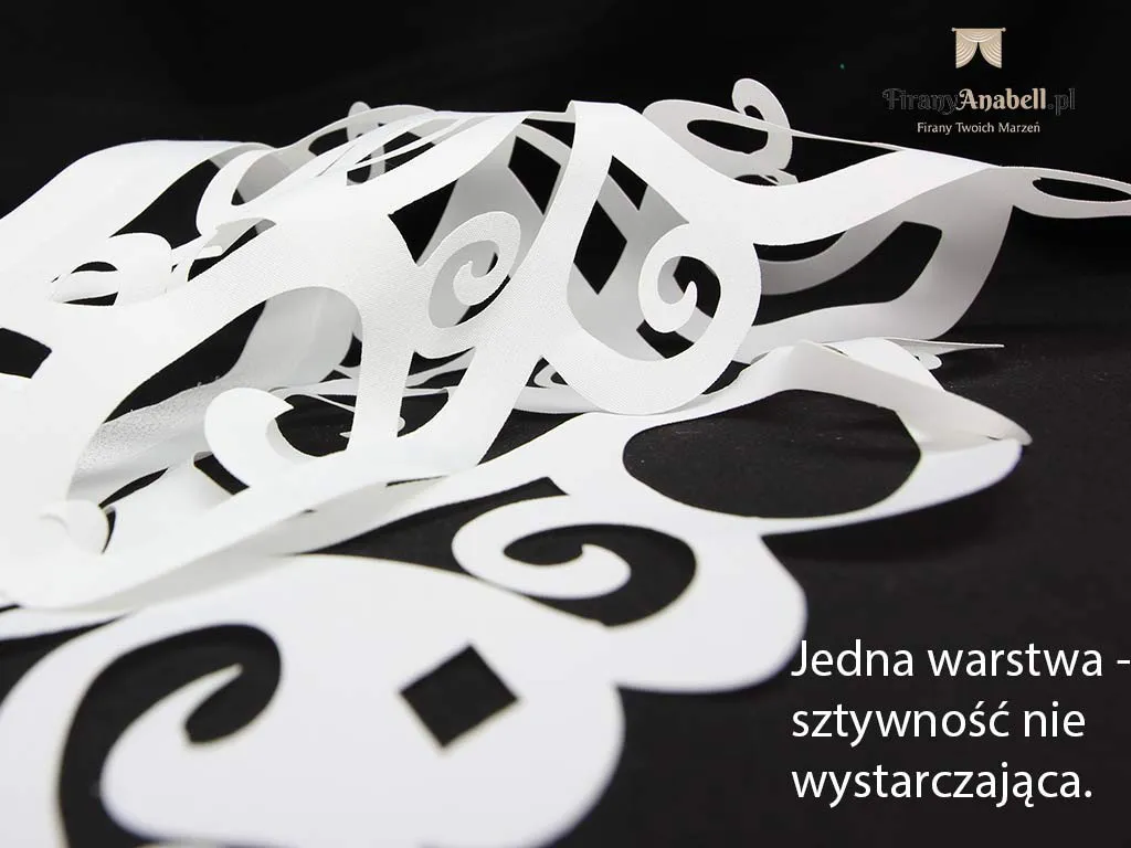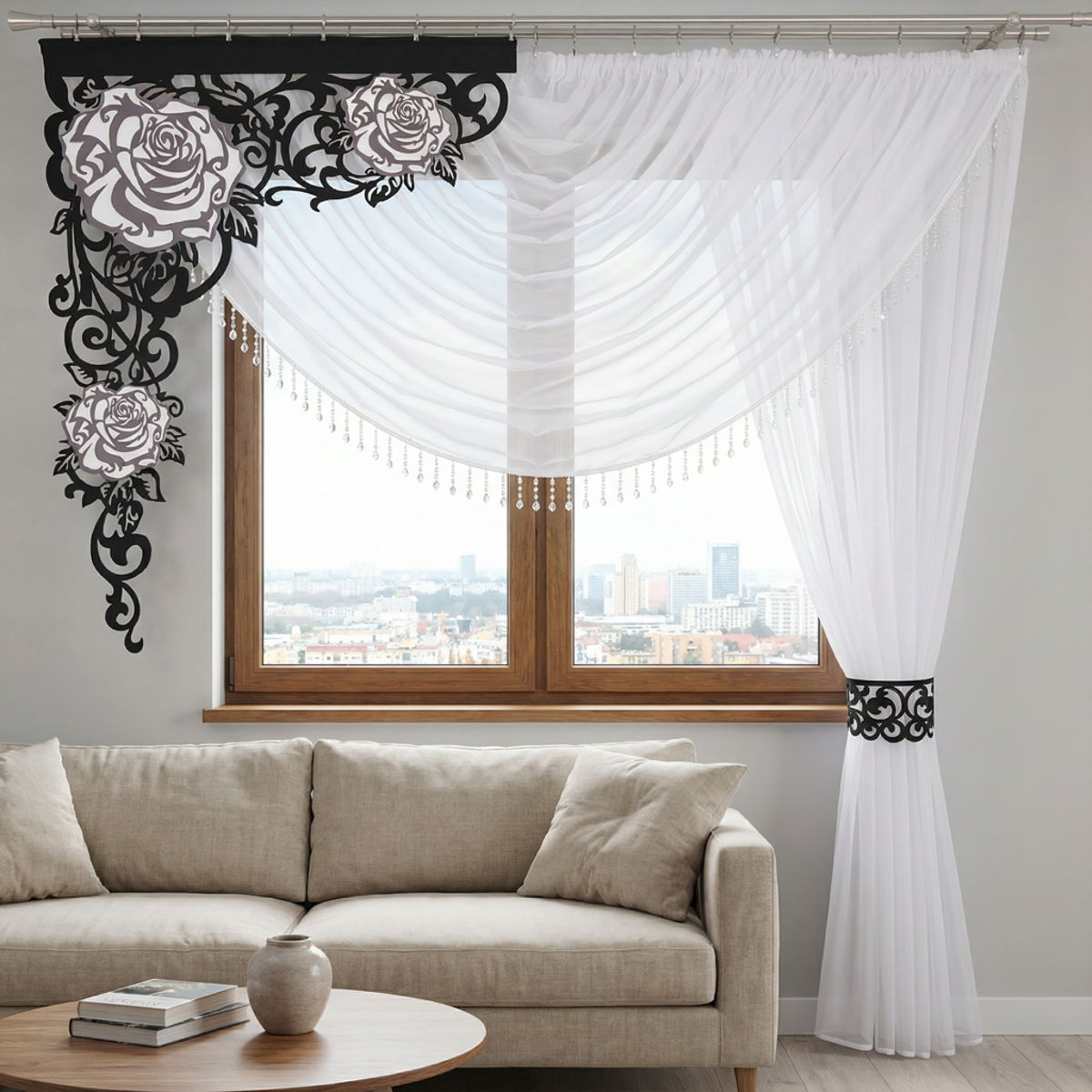 W tej wersji firany zastosowany został ażurowy narożnik 3D z kolorowymi kwiatami, który stanowi mocny, dekoracyjny akcent. Dzięki przestrzennej formie oraz detalom kwiatowym całość wygląda jeszcze bardziej efektownie i elegancko.