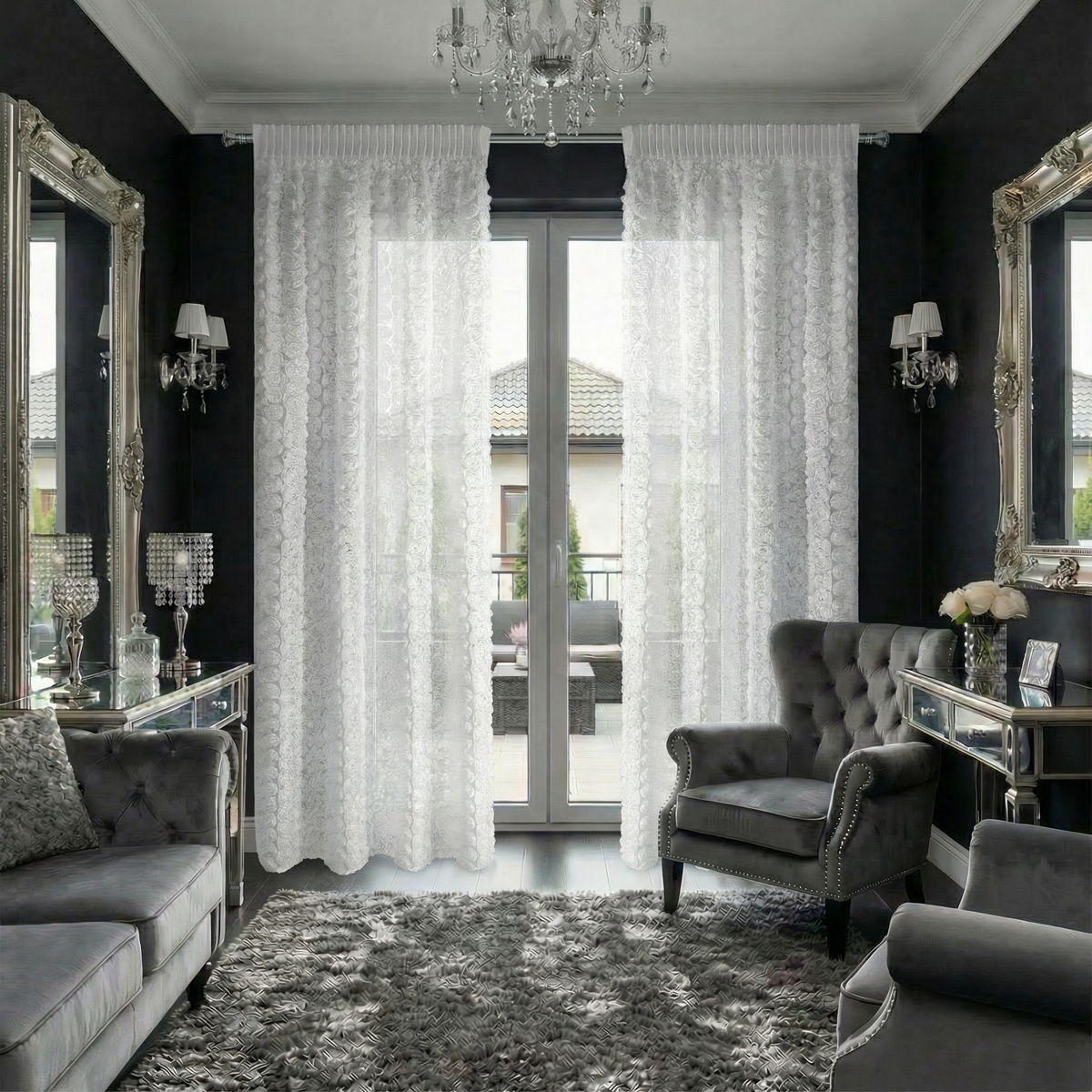 Zasłona gotowa z szyfonu z różami po całości – biała 140 x 270 cm