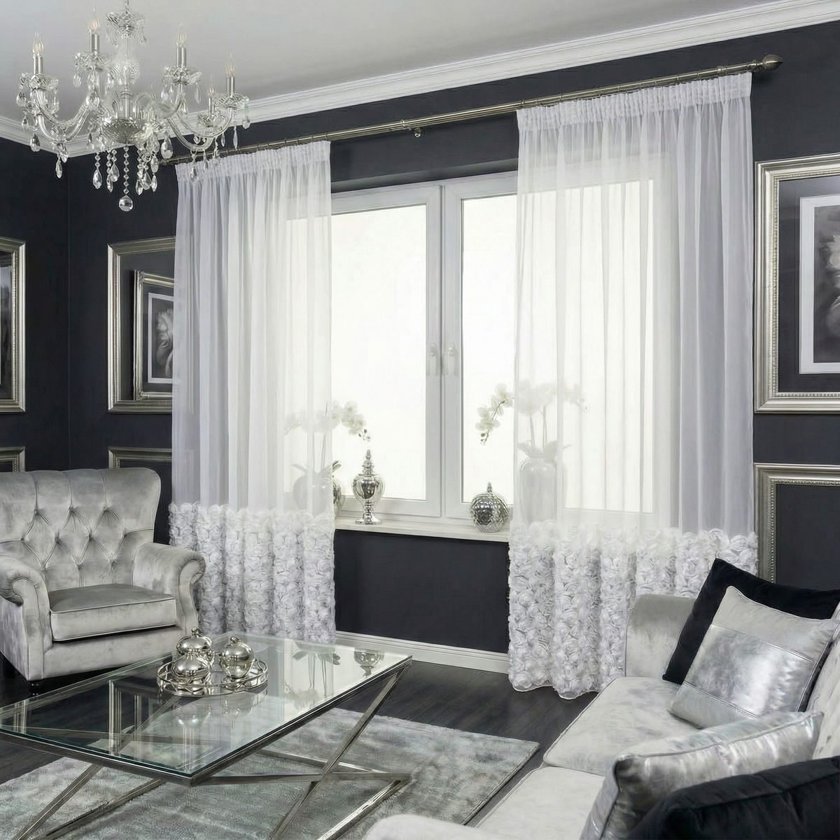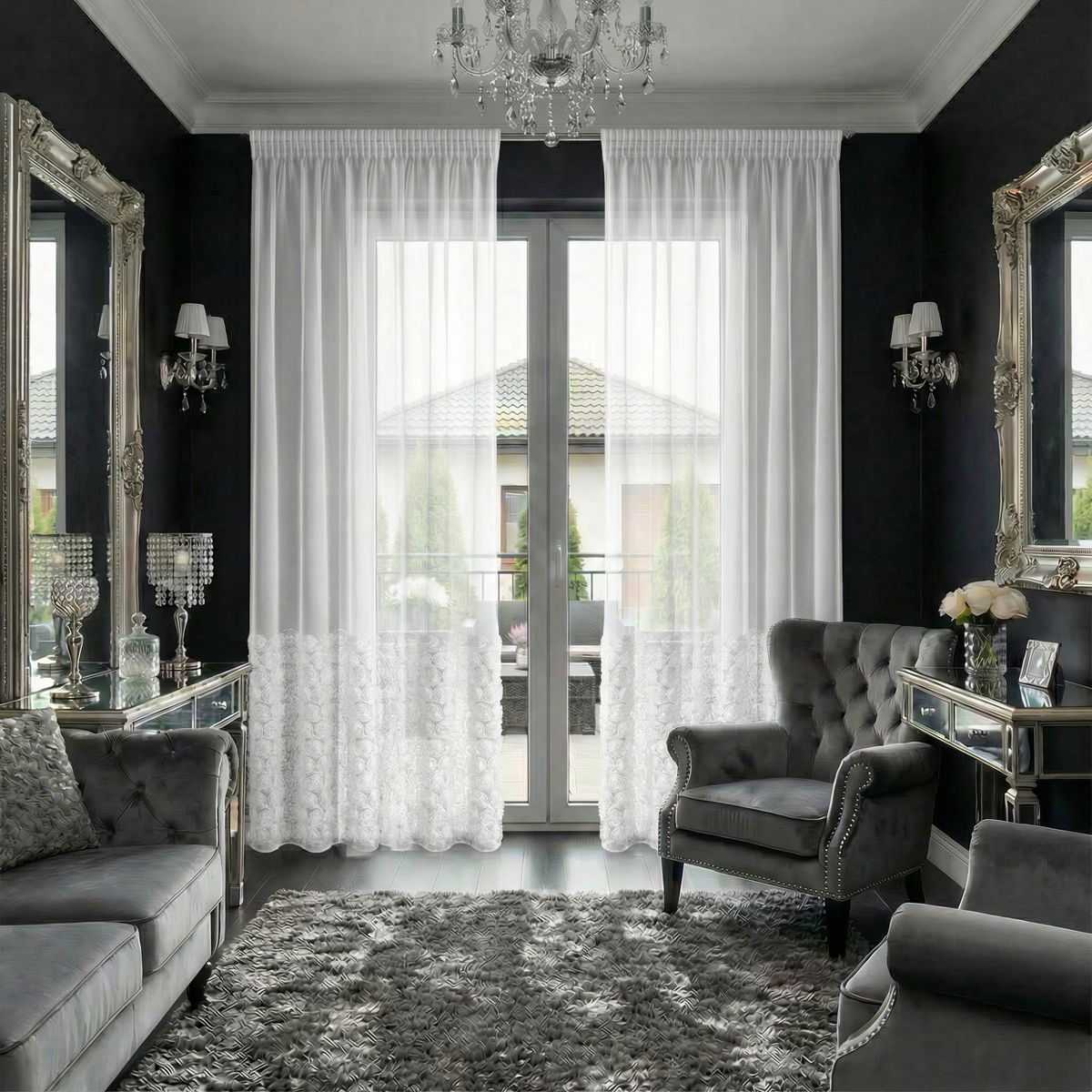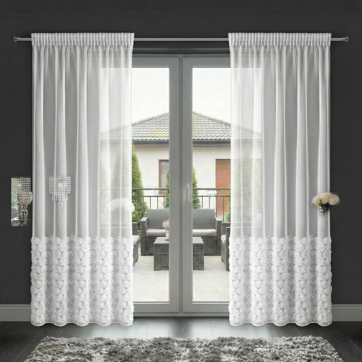 Efektowna firana gotowa z siatki to doskonały wybór dla osób, które chcą podkreślić aranżację okna eleganckim i romantycznym dodatkiem. Model został ozdobiony aż 12 dekoracyjnymi pasami róż, dzięki czemu prezentuje się wyjątkowo bogato i przyciąga wzrok, tworząc piękną ozdobę wnętrza.