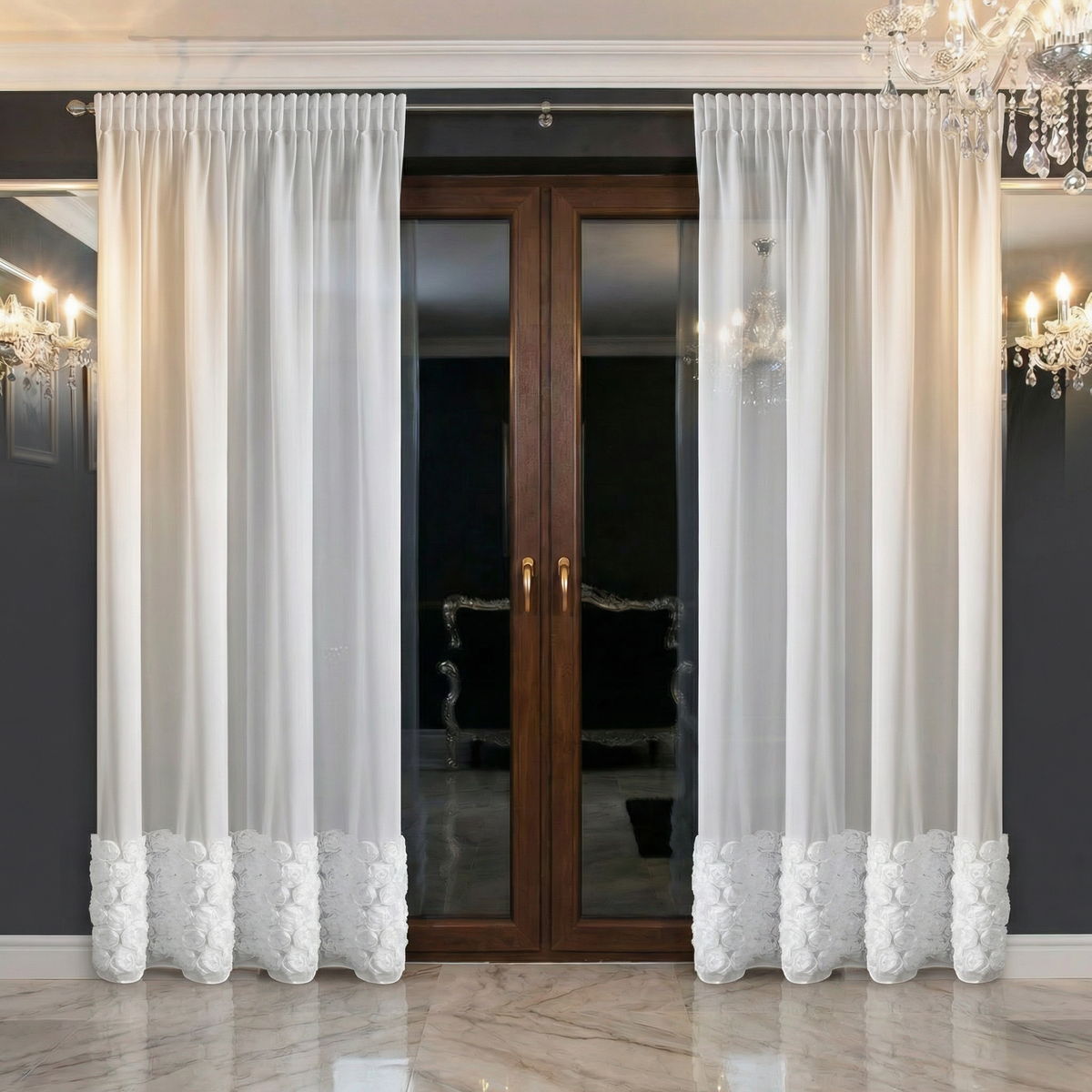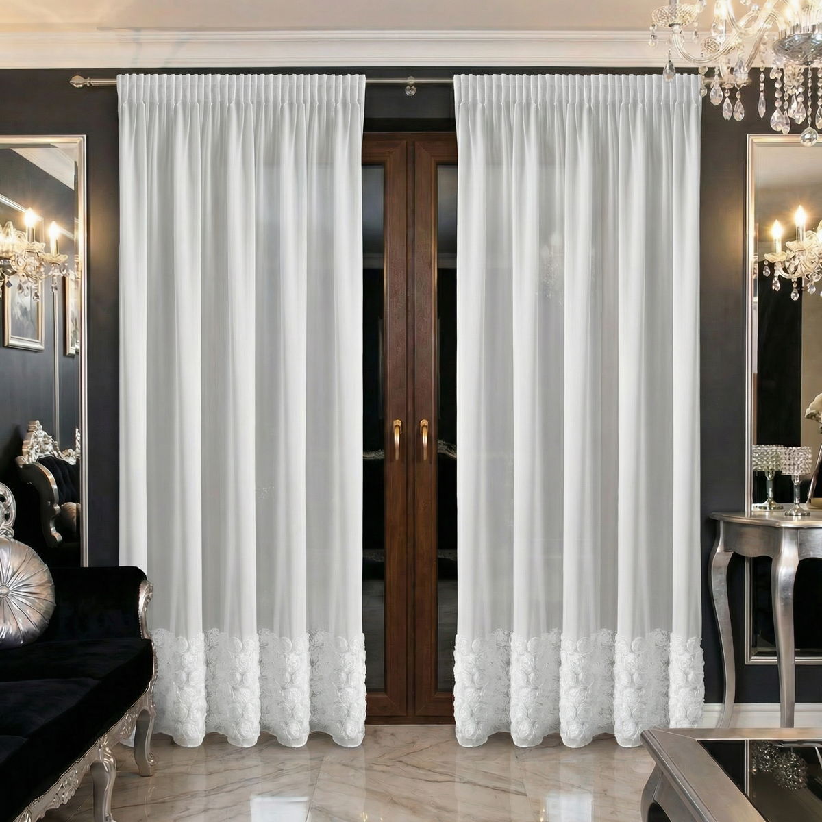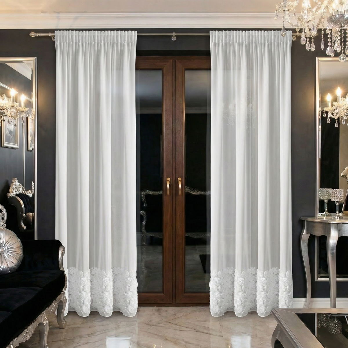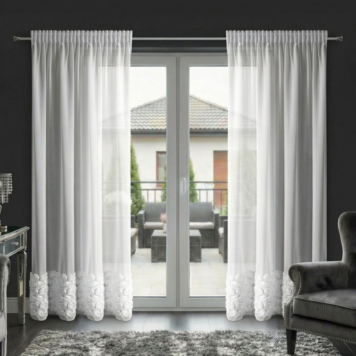Stylowa i niezwykle efektowna firana gotowa z szyfonu to doskonały wybór dla osób, które chcą nadać swojemu wnętrzu elegancki, a jednocześnie romantyczny charakter. Model został ozdobiony 6 dekoracyjnymi pasami róż, które stanowią piękną ozdobę okna i przyciągają wzrok, tworząc wyjątkowy klimat w pomieszczeniu.