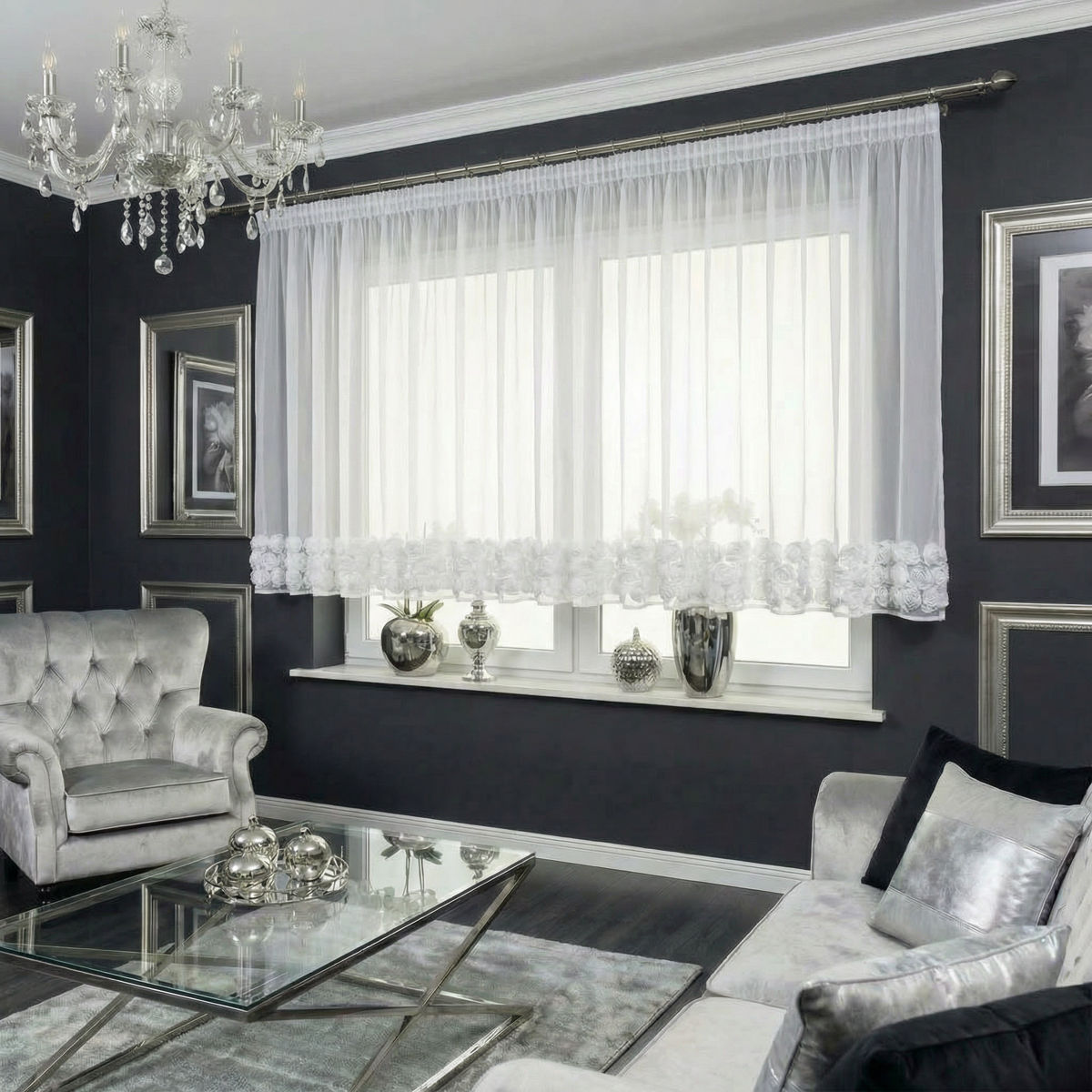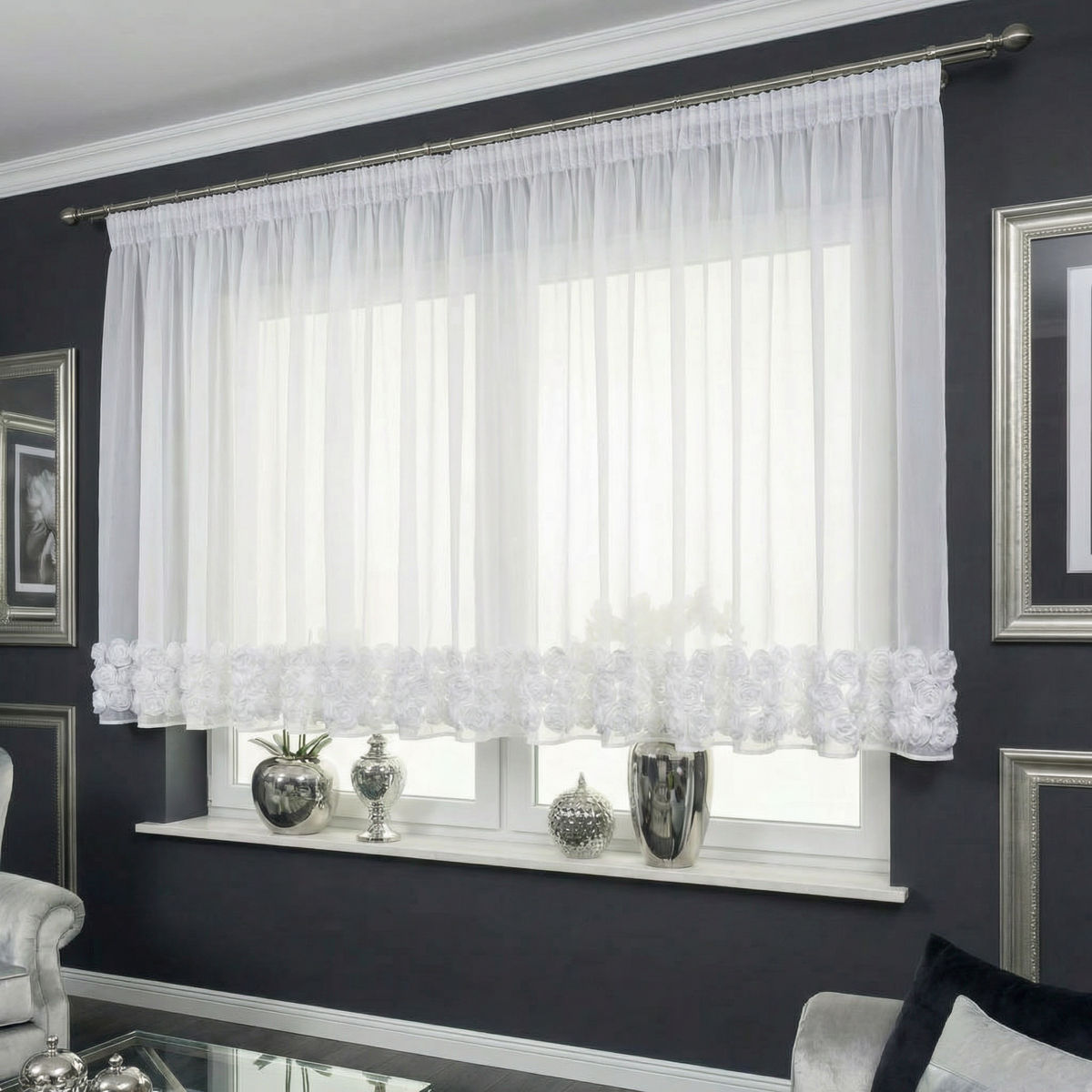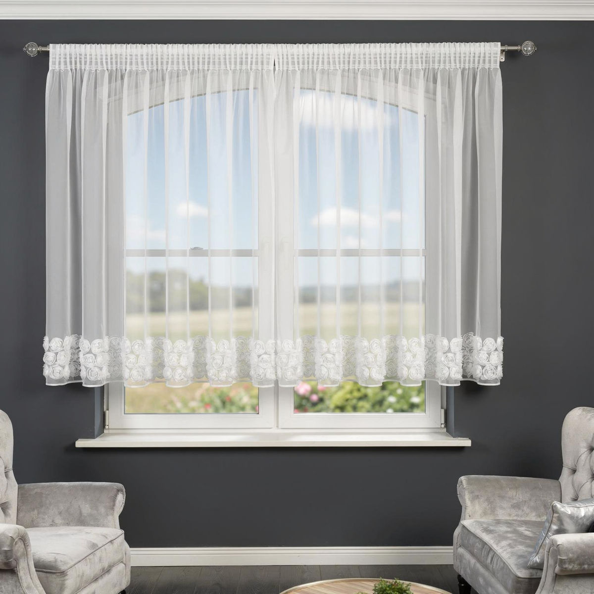 Nadaj wnętrzu lekkości i romantycznego uroku dzięki eleganckiej firanie gotowej wykonanej z delikatnego szyfonu. Model ozdobiony trzema pasami dekoracyjnych róż pięknie prezentuje się w oknie, stanowiąc wyjątkową ozdobę salonu, sypialni czy pokoju dziennego. To idealna propozycja dla osób, które szukają subtelnej dekoracji, ale z wyraźnym, stylowym akcentem.