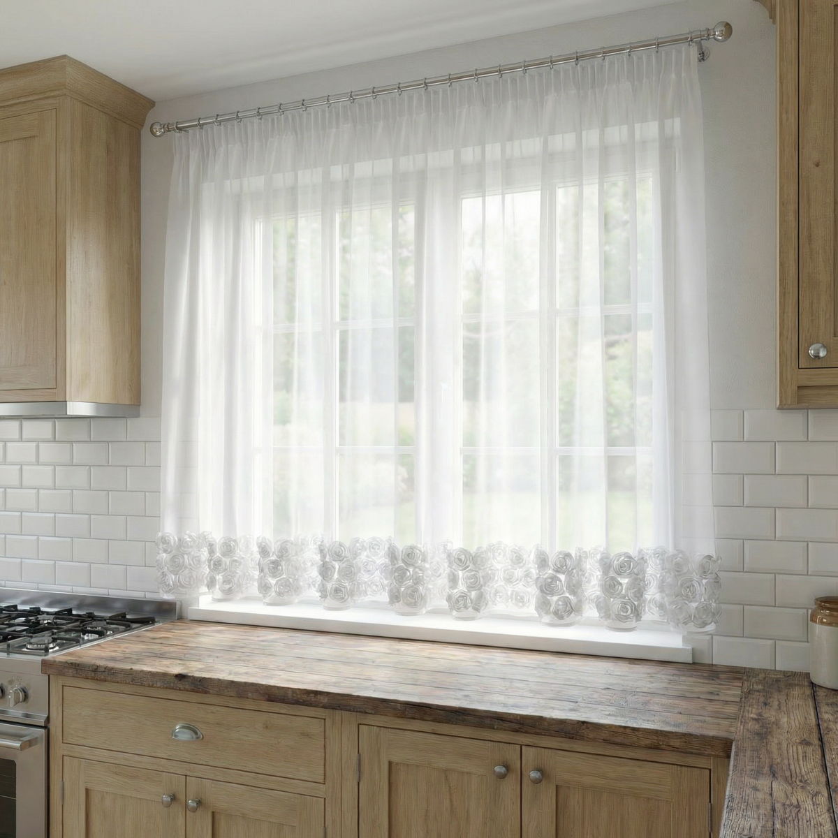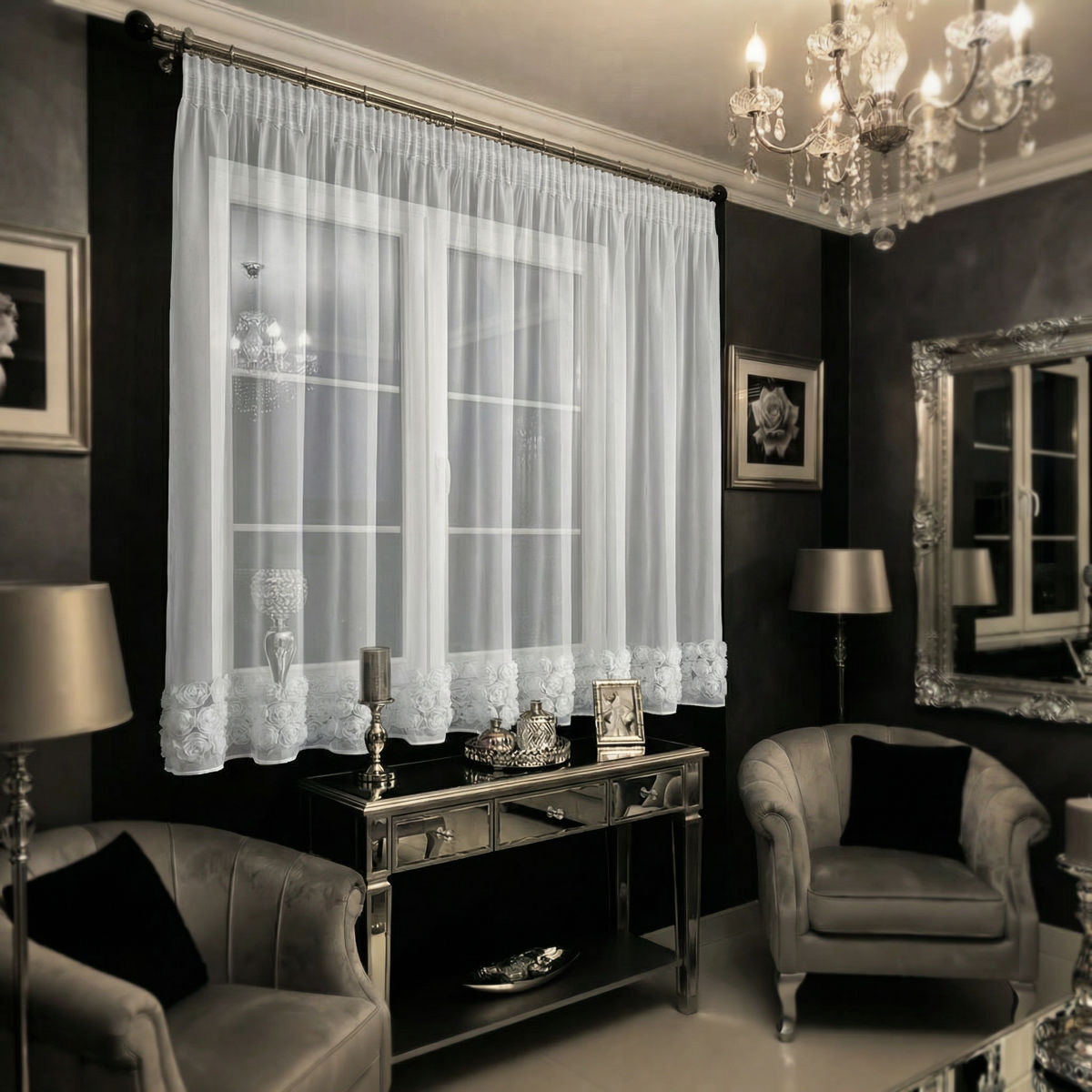 Firana z motywem róż sprawdzi się zarówno jako elegancka ozdoba na co dzień, jak i podczas wyjątkowych okazji. Przepuszcza światło dzienne, tworząc jasną i przytulną atmosferę, a przy tym dodaje wnętrzu klasy i delikatnego charakteru.