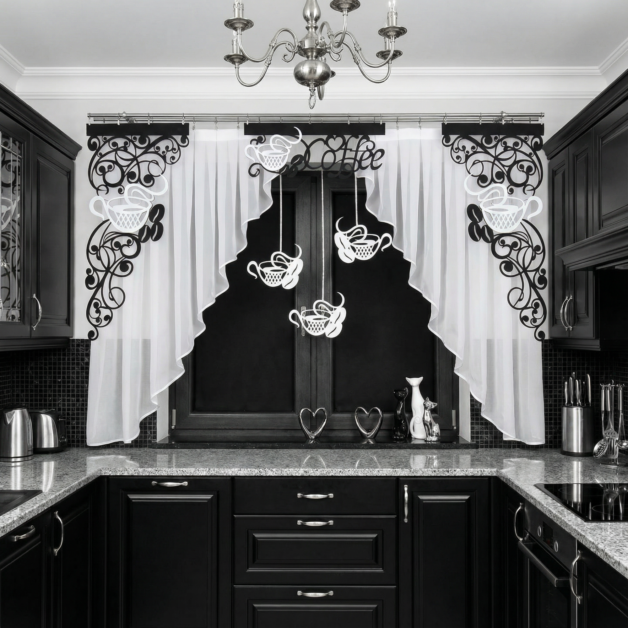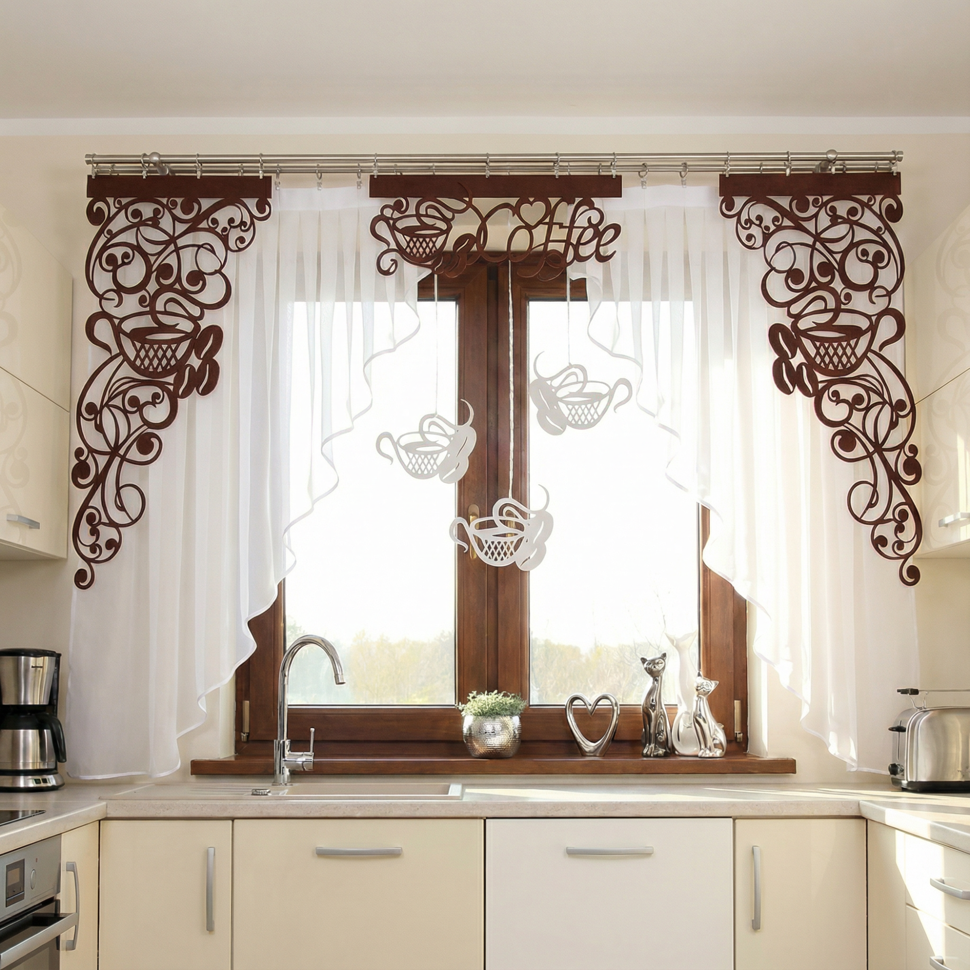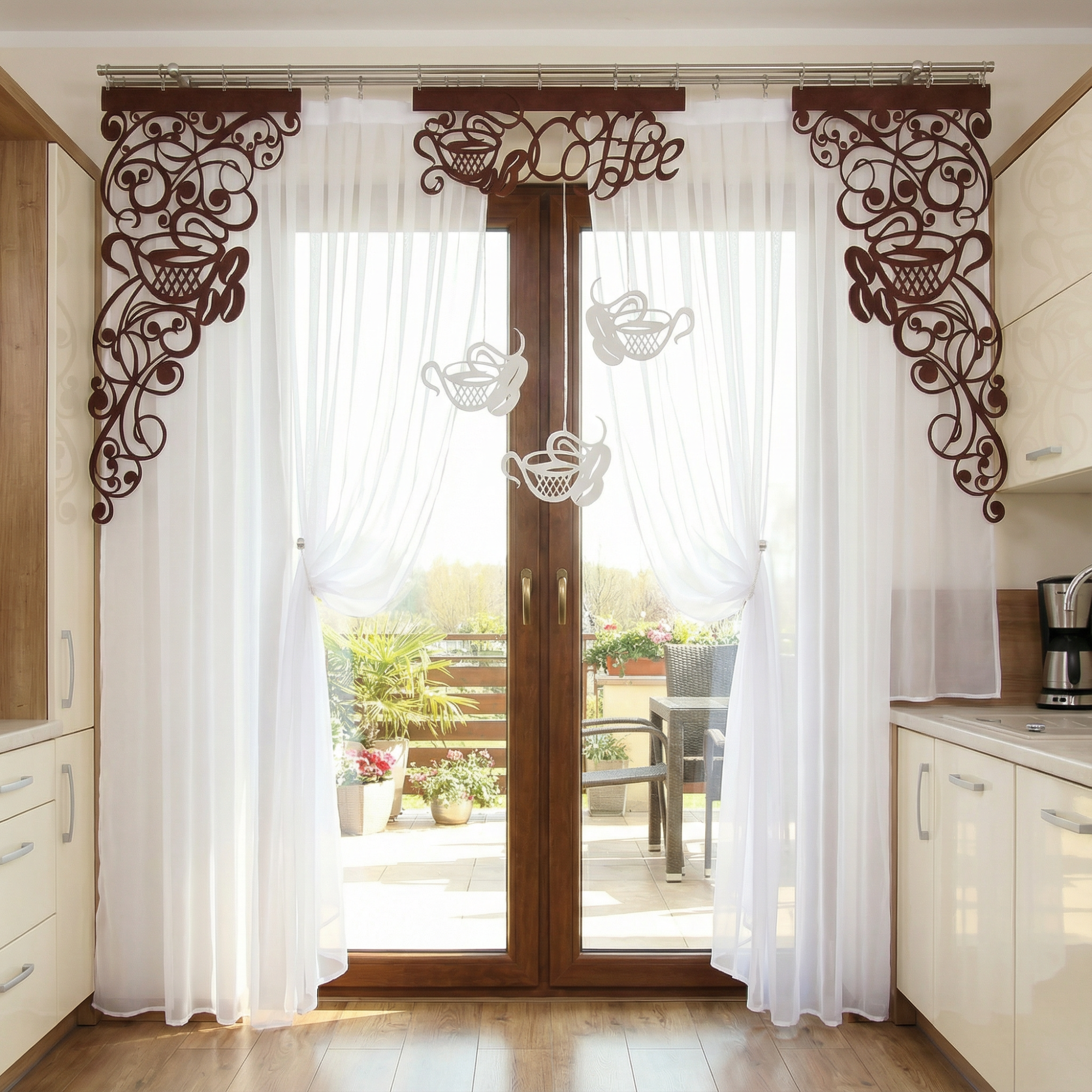 Firana z ażurem i zawieszkami Coffee2 utrzymana jest w "estetyce kawowej", dzięki czemu dekoracja staje się nie tylko praktycznym elementem wyposażenia, ale także stylową ozdobą, która przyciąga wzrok i zachęca do skosztowania aromatycznego napoju.