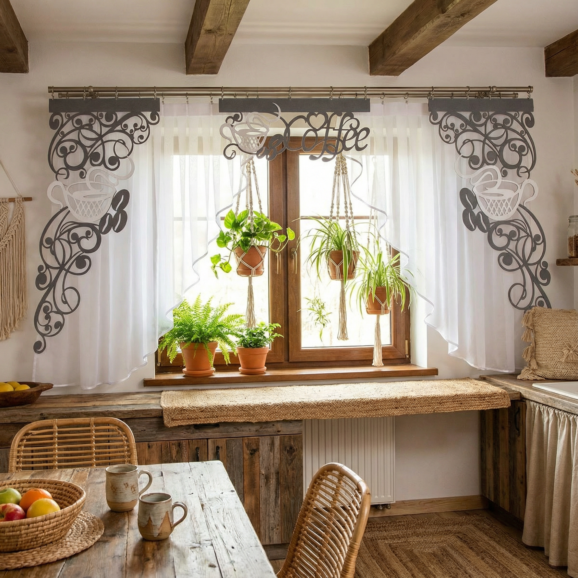 Firana z ażurem i zawieszkami Coffee2 to starannie zaprojektowany zestaw, który wnosi nutę przytulnego ciepła. Składa się z następujących elementów: