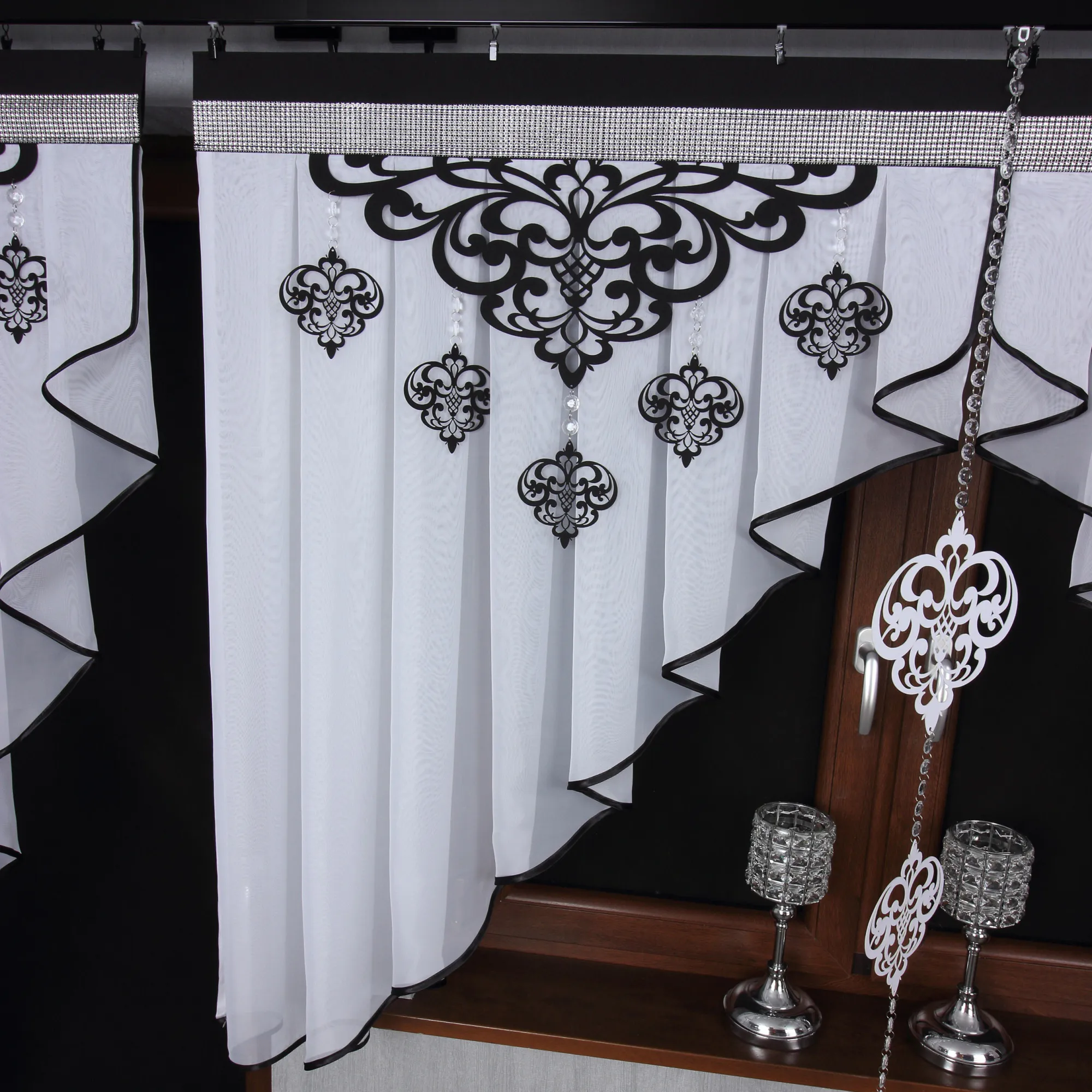 Dodatkowym elementem dekoracyjnym jest wisiorek z akrylowymi koralikami, zawieszony na środku firany. Jego wysokość wynosi 120 cm.