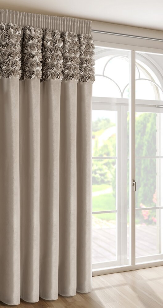 Zasłona gotowa welwetowa z 6 pasami ozdobnych róż szerokość: 140 cm, długość: 270 cm, kolor: ciemnobeżowy, Gramatura: 200 GSM, Skład: 100% poliester